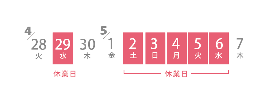 誠に勝手ではございますが、ゴールデンウィーク期間中の休業を下記の日程とさせていただきます。