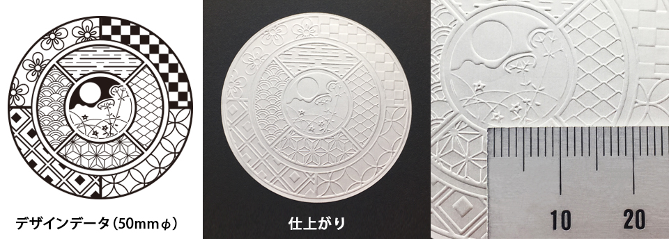 エンボスは箔押しのようにかすれたり、埋まってしまうことはあまりありません。このような細かい複雑なデザインでも表現できます。